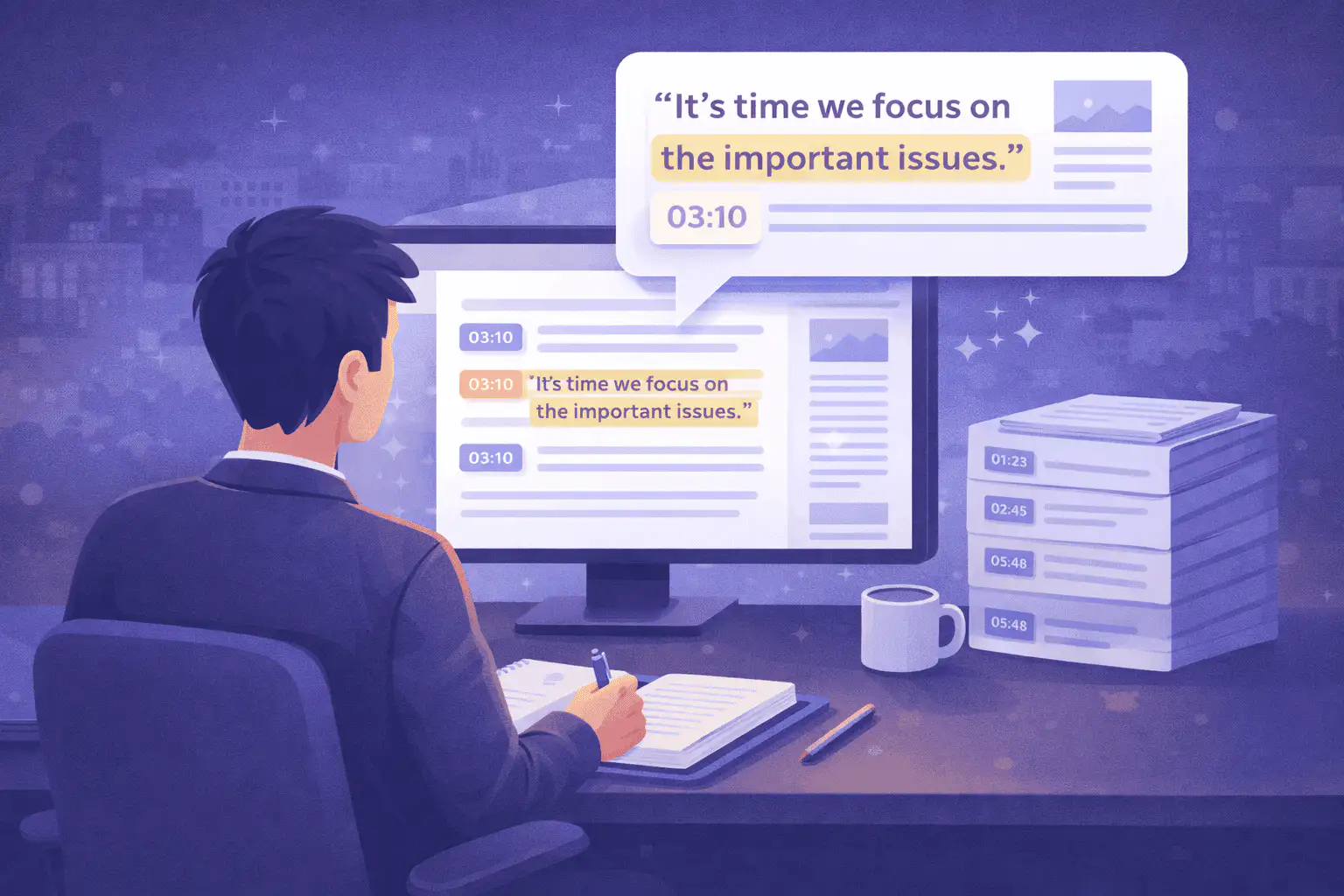 "When our executive director gives a keynote or appears on a podcast, I need the exact transcript for press releases and social media pull quotes. This tool gives me the words and the timestamps in seconds. No more rewatching 45-minute speeches with a notepad."