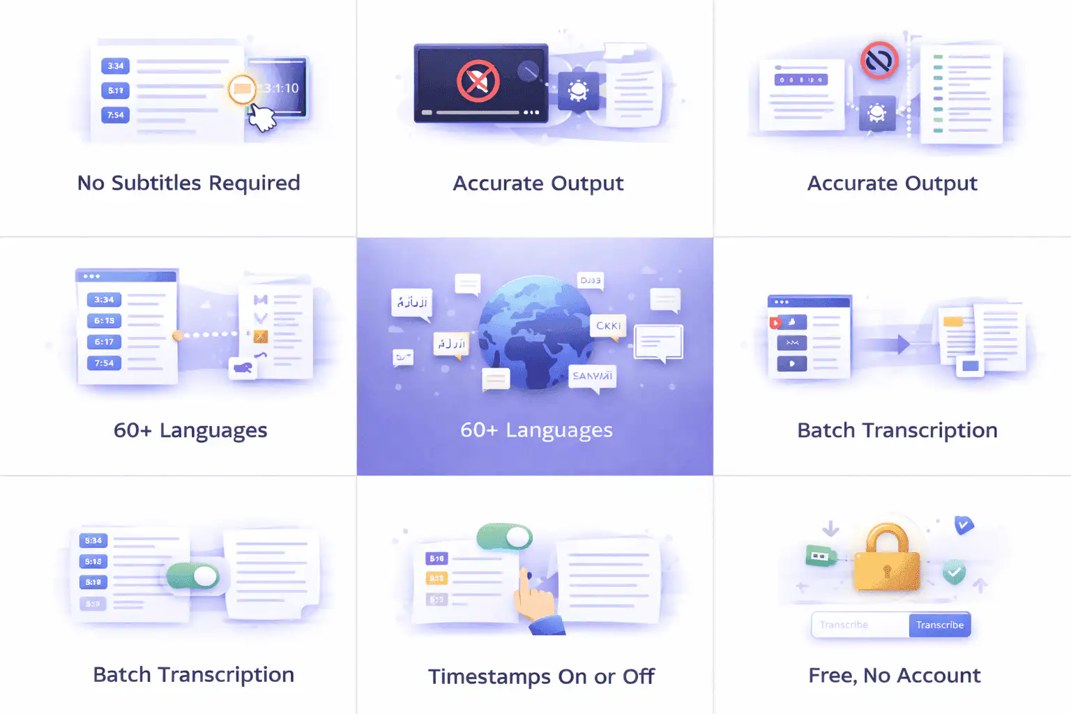 Transcribe any YouTube video fast and free. Get accurate, timestamped transcripts in multiple languages — no sign-up needed.