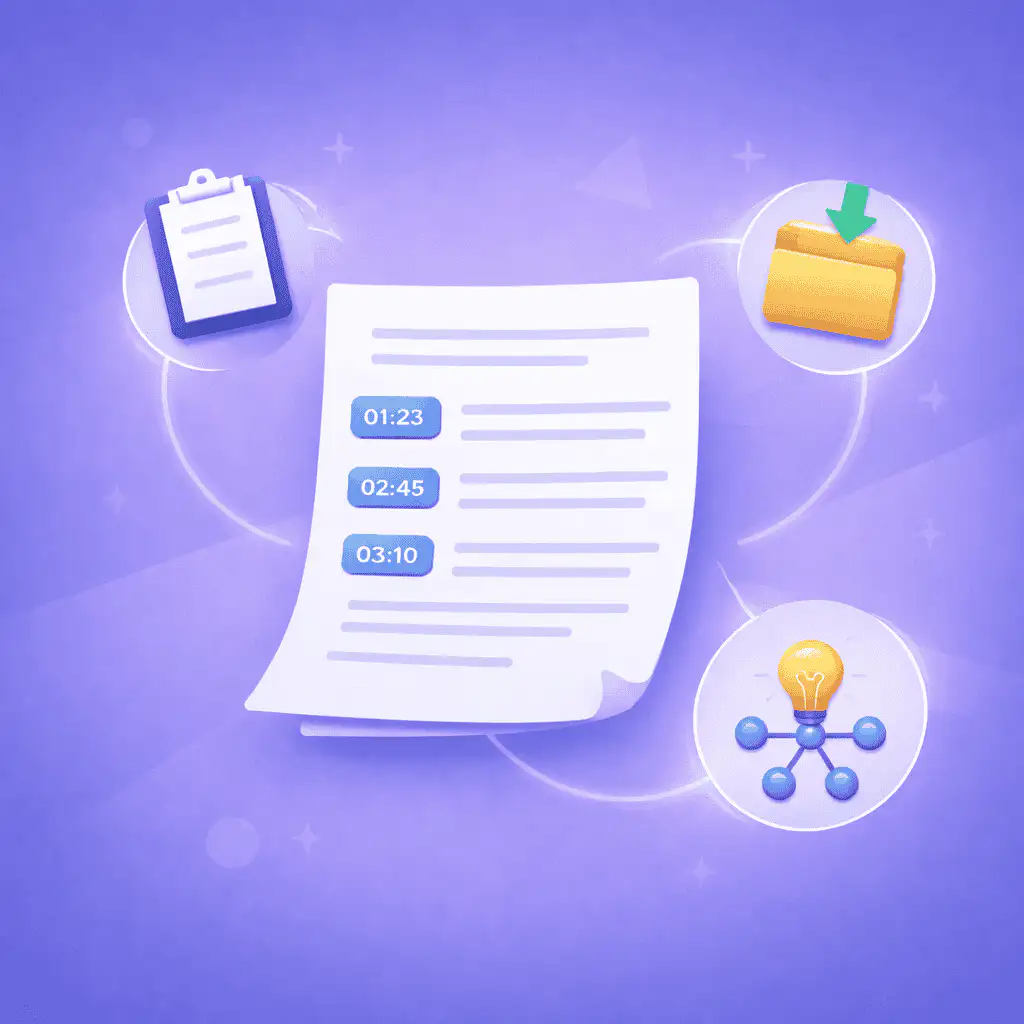 Every line of your transcript connects directly to the moment it was spoken. Click a timestamp and the video jumps to that exact spot. This is not a nice-to-have — it is essential for anyone who needs to cite sources, verify quotes, navigate long recordings, or study specific sections without rewatching everything.